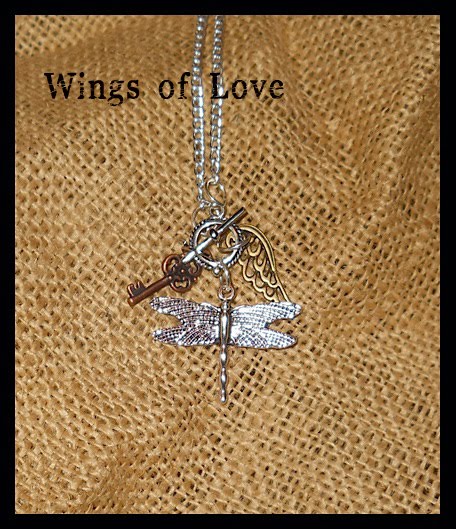 A Wing and a Prayer: Silver-toned necklace with toggle clasp that holds 3 beautiful charms, including a small burnished key, silver-toned dragonfly, and silver-toned Tibetan angel wing that I was recently able to procure.