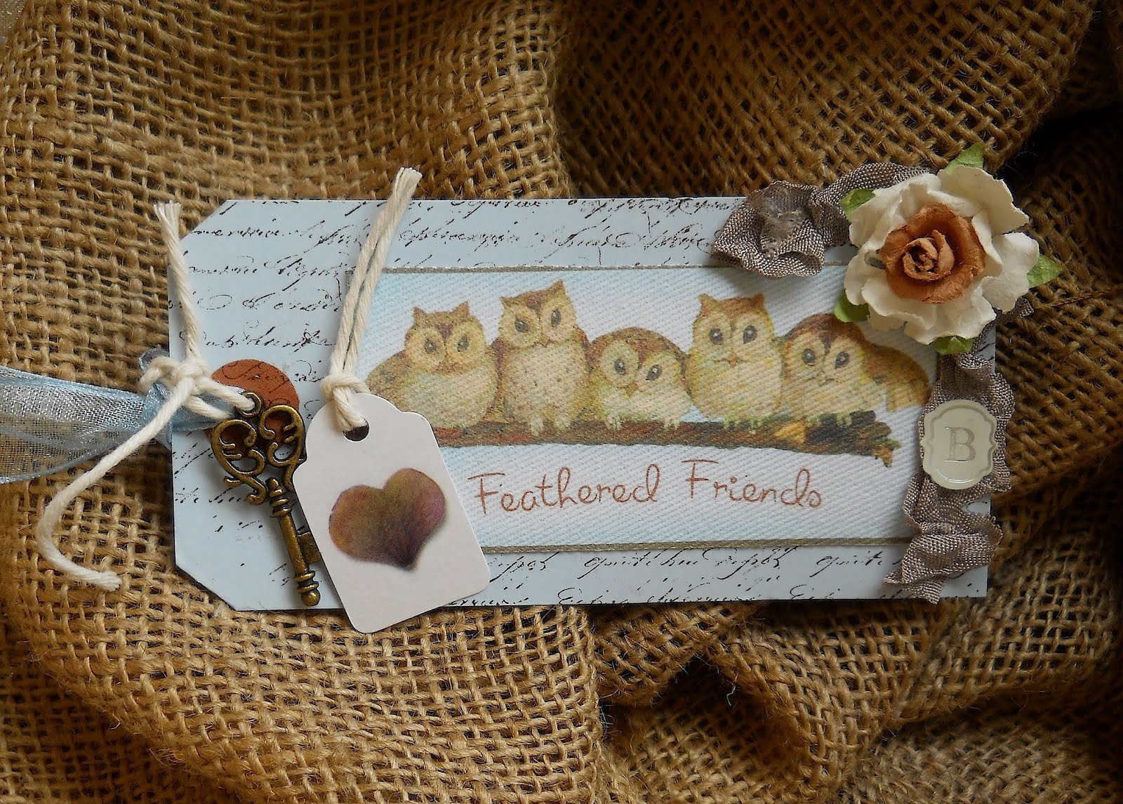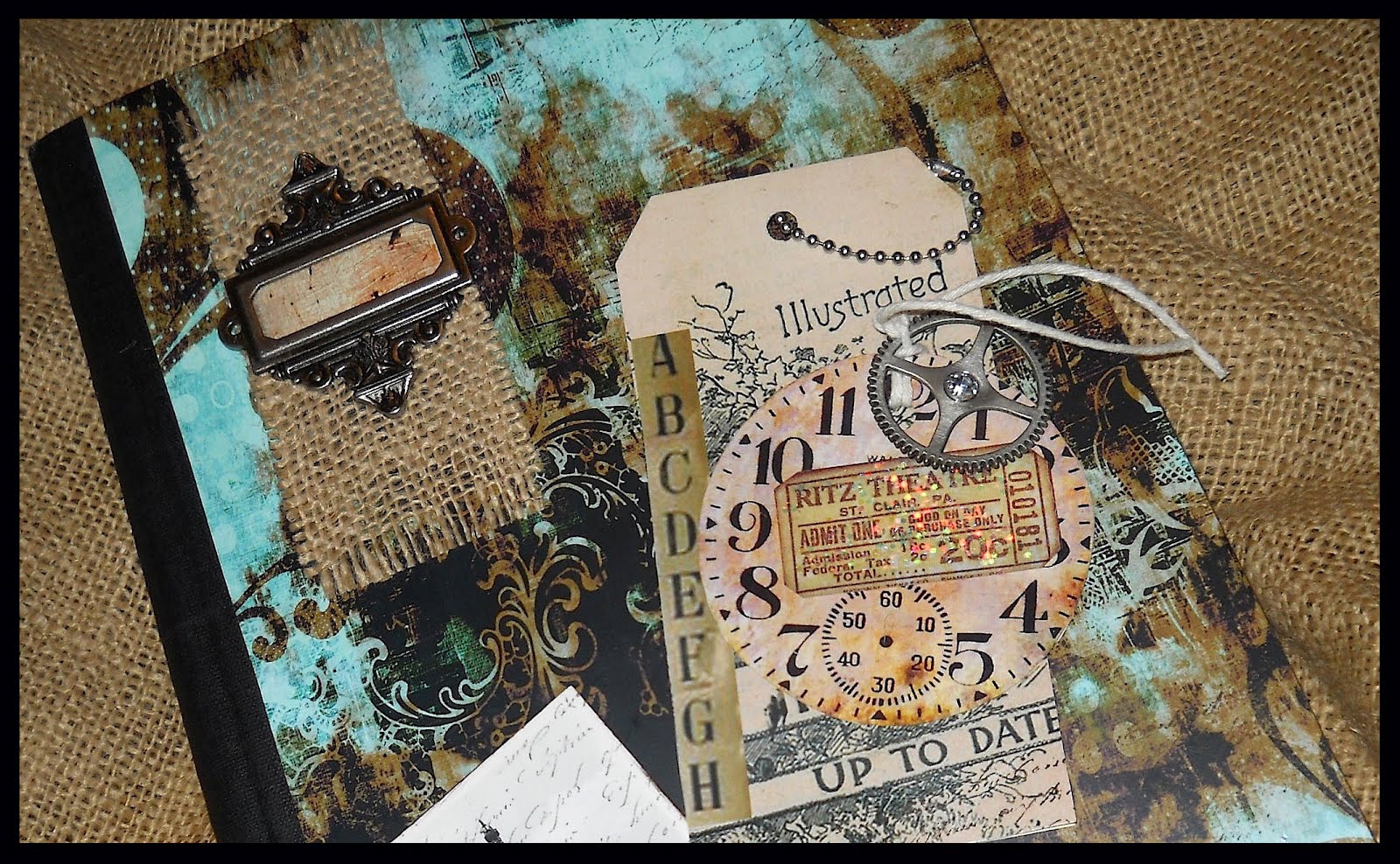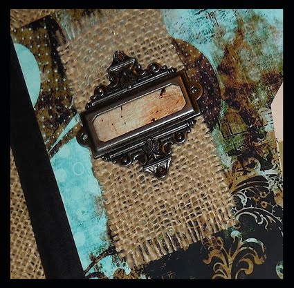 Step 3: Choose any embellishments you like--Here I used burlap, as well as a Tim Holtz metal decorative piece, plus other items that struck my fancy.